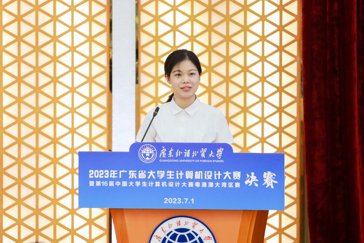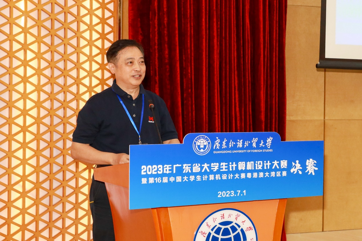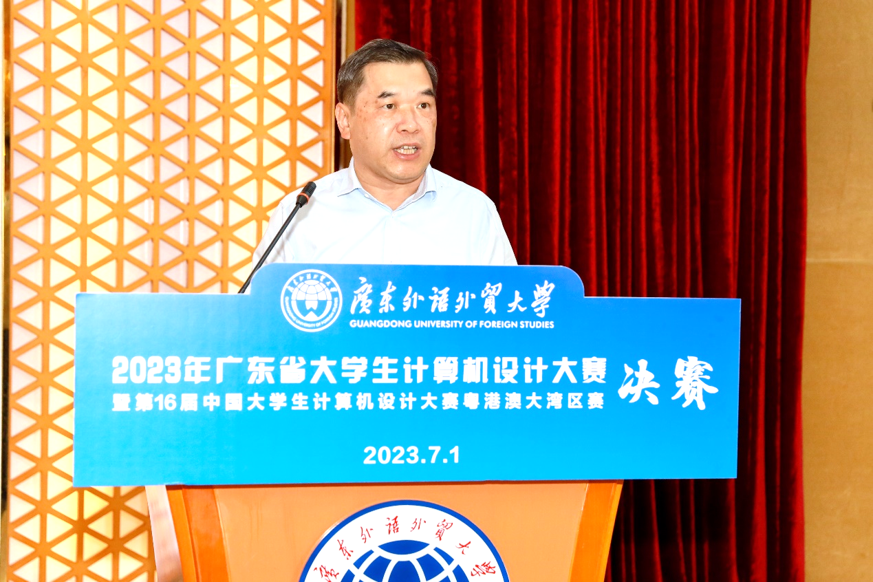 本网讯 2023年7月1日,由广东省教育厅主办的2023年广东省大学生计算机设计大赛暨第16届中国大学生计算机设计大赛粤港澳大湾区赛决赛在广东外语外贸大学大学城校区成功举办。广东省教育厅高等教育处副处长吴华明,广东外语外贸大学校党委常委、副校长焦方太,教务部副部长唐静,现代教育技术中心副主任廖信海,75位专家评委、部分带队教师出席了决赛开幕式。开幕式由信息科学与技术学院/网络空间安全学院院长王常吉教授主持。
