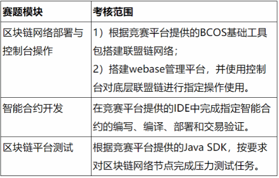 2)高职组决赛赛题是实践操作题,以现场答题的方式进行。学生须在规定的时间内,完成指定的区块链实操任务,赛题内容以Ficso BCOS区块链平台为基础,涉及的技术模块包括但不限于:区块链网络部署与控制台操作、智能合约开发、区块链平台测试等内容,详情如下:
