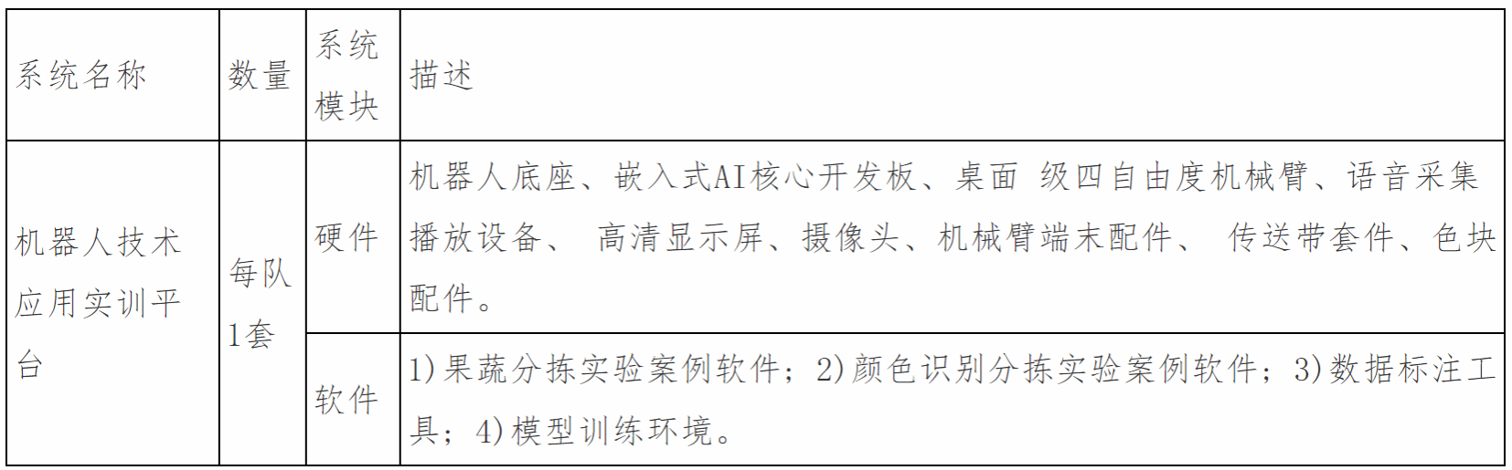 本赛项采用“机器人技术应用实训平台”,平台由机器人底座、嵌入式AI核心开发板、桌面级四自由度机械臂、语音采集播放设备、高清显示屏、摄像头、机械臂端末配件、传送带套件、色块配件等部件组成,其中嵌入式AI核心开发板提供不小于3.0Tops神经网络算力、深度学习算法以及丰富的开发接口,配套机器人技术应用实训平台、模型接口SDK、模型训练工具、实验手册,涵盖人工智能深度学习、计算机视觉等技术内容,满足竞赛和教学需要,为竞赛和教学提供应用开发和创新基础。