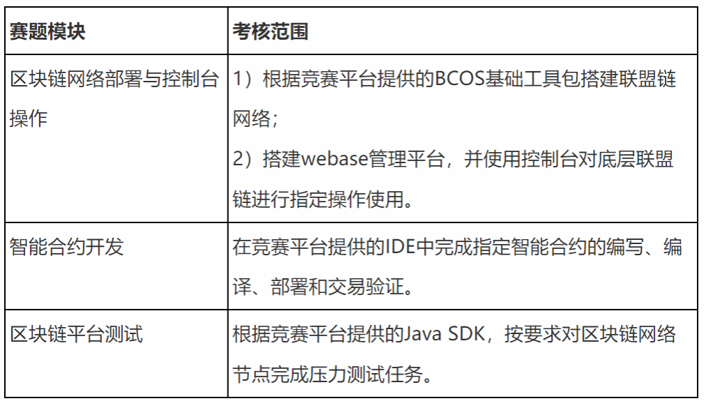 2)高职组决赛赛题是实践操作题,以现场答题的方式进行。学生须在规定的时间内,完成指定的区块链实操任务,赛题内容以Ficso BCOS区块链平台为基础,涉及的技术模块包括但不限于:区块链网络部署与控制台操作、智能合约开发、区块链平台测试等内容,详情如下: