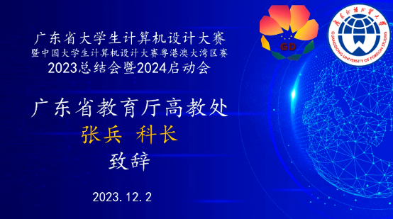 本网讯 2023年12月2日上午,由广东省教育厅主办、广东外语外贸大学承办的广东省大学生计算机设计大赛2023总结会暨2024启动会在线上成功举办。广东省教育厅高教处科长张兵,大赛组委会副主任王常吉教授、组委会副秘书长李宇耀博士,各参赛队伍指导教师代表及参赛学生代表等近160人出席此次会议,会议由大赛组委会秘书长谢柏林副教授主持。