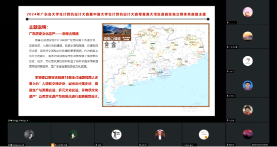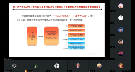 启动会的第三项议程,是由广东外语外贸大学艺术学院刘晶鑫老师解读2024年赛区独立媒体类主题。与国赛媒体类主题的不同的是,赛区独立媒体类主题只在粤港澳大湾区赛区遴选作品并颁奖,不设国赛通道。2024赛区独立媒体类主题为“广东历史文化遗产——南粤古驿道”,此主题限定类别为“广东AIGC技术应用”。刘老师详细说明该主题包含的南粤古驿道18条重点线路和四大古港上的古道和交通史迹、城市与村落史迹、商品生产与贸易史迹、多元文化史迹、非物质文化遗产等五类文化遗产为创意点进行主题视觉设计的内涵。