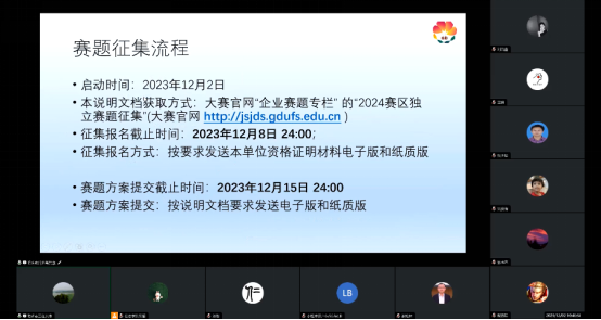 启动会的最后一项议程,由中山大学毛明志教授对赛区独立赛题征集方案进行专项解读。据了解,2024年将是大赛第三次试行设立赛区独立赛题,跟前两年一样,赛区独立赛题面向粤港澳大湾区赛区参赛师生,不设国赛通道。为了规范赛区独立赛题的管理,组委会将从会议当天起启动2024年赛区独立赛题的征集流程。毛教授首先邀请符合资格要求的企业参与大赛赛题征集,然后详细说明了参与的基本条件、需提供的资料以及赛题征集流程。