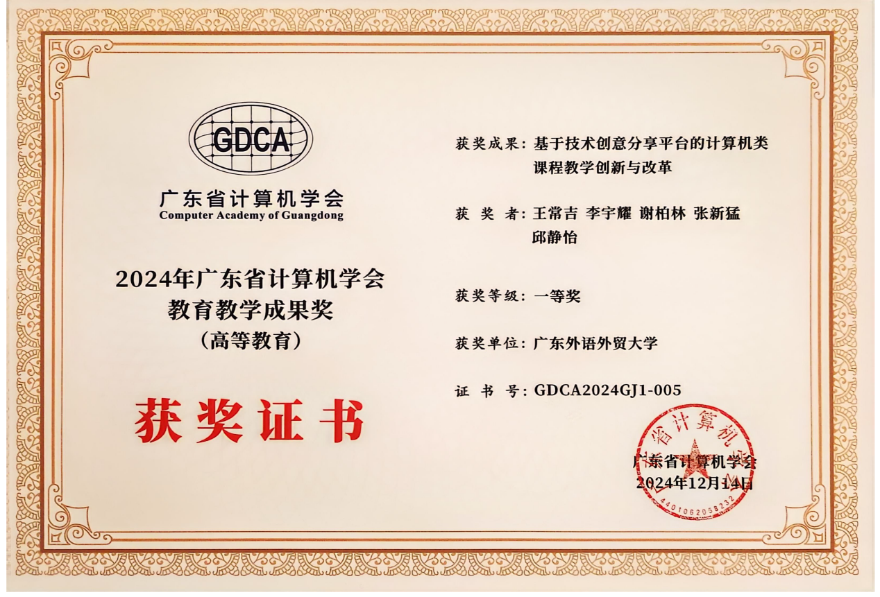 近日,我院申报的“基于技术创意分享平台的计算机类课程教学创新与改革”项目荣获广东省计算机学会教学成果一等奖。学院王常吉院长与信息技术教学部李宇耀主任作为团队代表,出席了广东省计算机学会40周年年会暨2024年学术年会的颁奖典礼。
