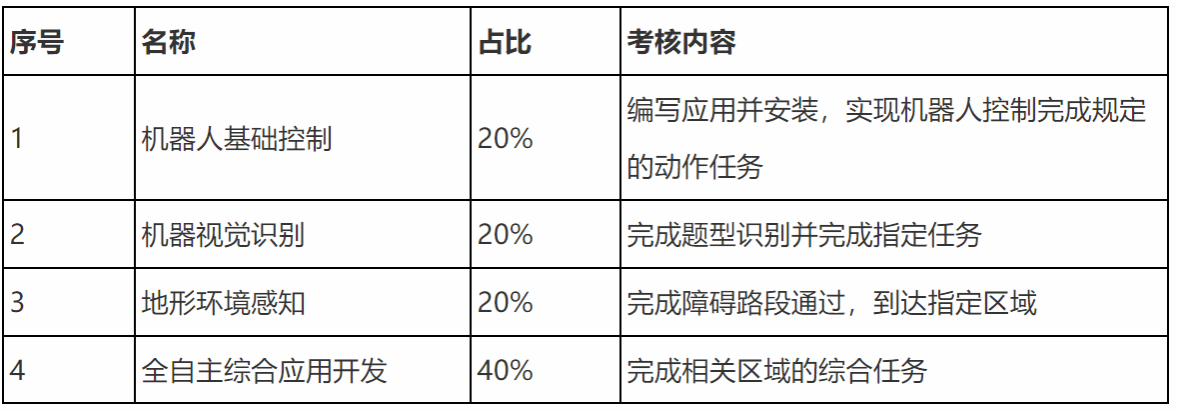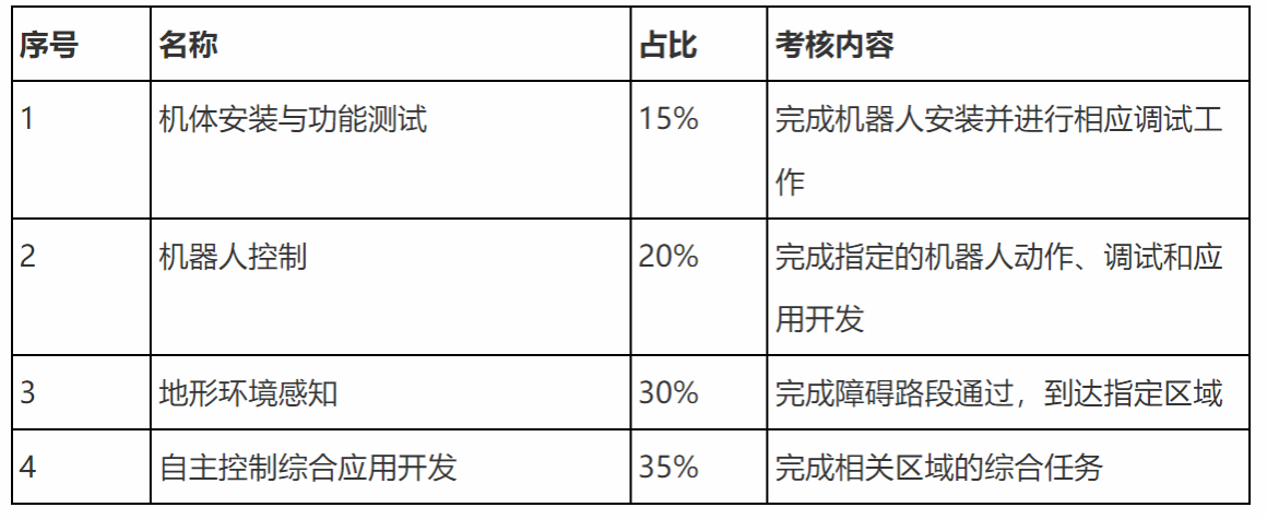 高职组评分为四个部分:机体安装与功能测试、机器人控制、地形环境感知、自主控制综合应用开发,共计总分为100分。