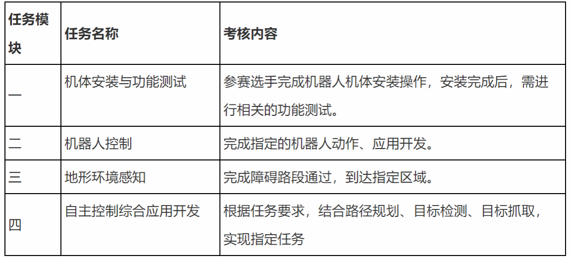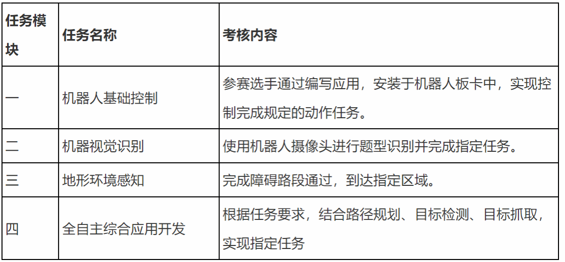 竞赛任务内容包括机器人基础控制、机器视觉识别、地形环境感知、全自主综合应用开发。考核的技术要点包含OpenHarmony应用开发、硬件接口调用、硬件通信技术、机器人运动控制技术、传感器应用、视觉识别技术。本赛项具体包括以下内容: