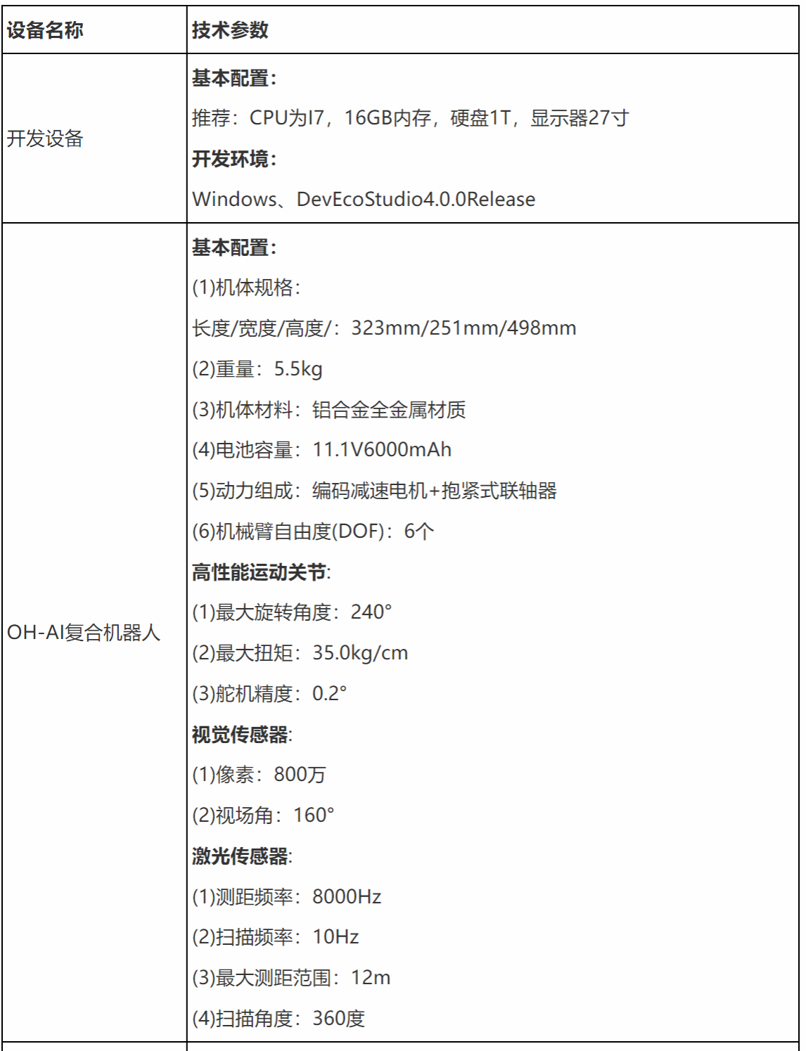 本赛项决赛使用指定“OH-AI复合机器人”平台完成综合应用技术实操考核任务。“OH-AI复合机器人”平台参数如下(以实际情况为准):