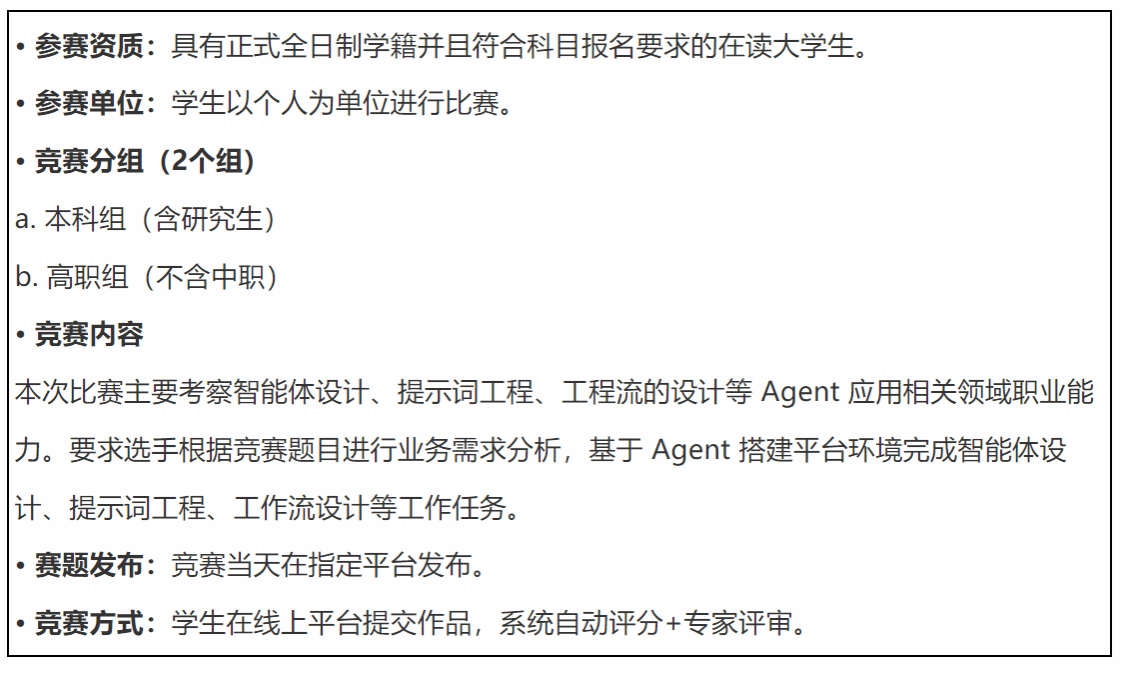 • 竞赛的名称为:人工智能应用(智能体开发)挑战赛