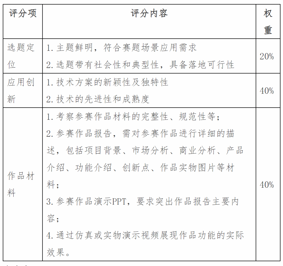 初赛竞赛需要参赛队伍在规定时间内提交作品材料,专家评委对作品评分,满分为100分。