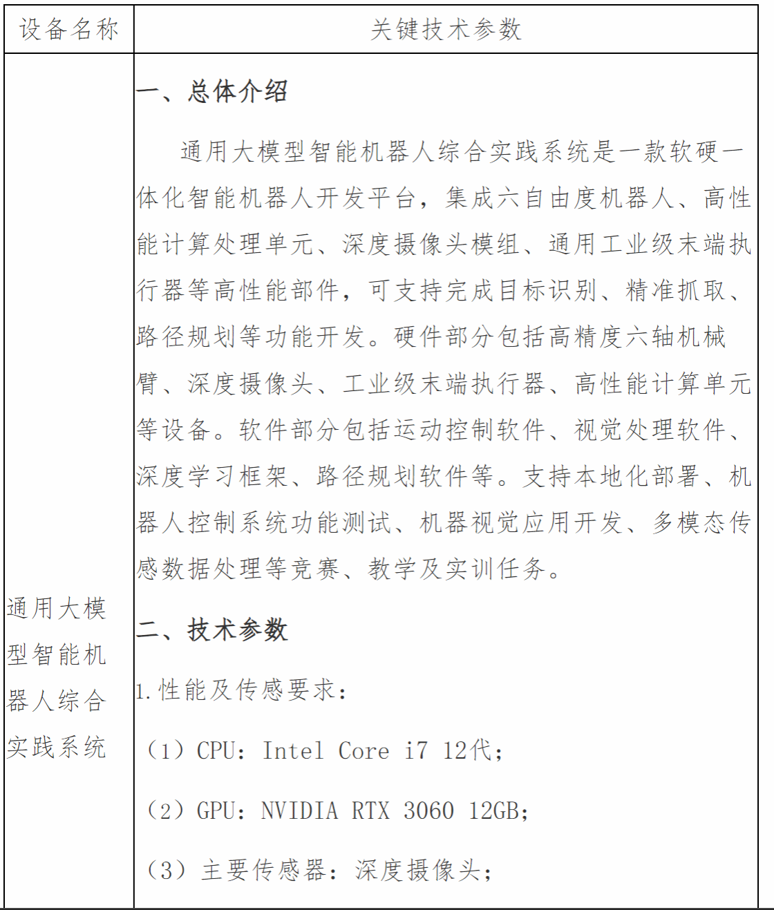 参赛队伍需要将最终可运行程序部署在智能机器人硬件上,参赛队伍可以使用已有设备进行部署和测试,但设备性能参数不可高于竞赛组委会推荐的通用大模型智能机器人综合实践系统。推荐统一使用竞赛组委会指定的通用大模型智能机器人综合实践系统,该设备具备较高的边缘算力和丰富的拓展功能,可有效提高参赛队伍任务完成效率。竞赛组委会推荐的通用大模型智能机器人综合实践系统性能参数如下:
