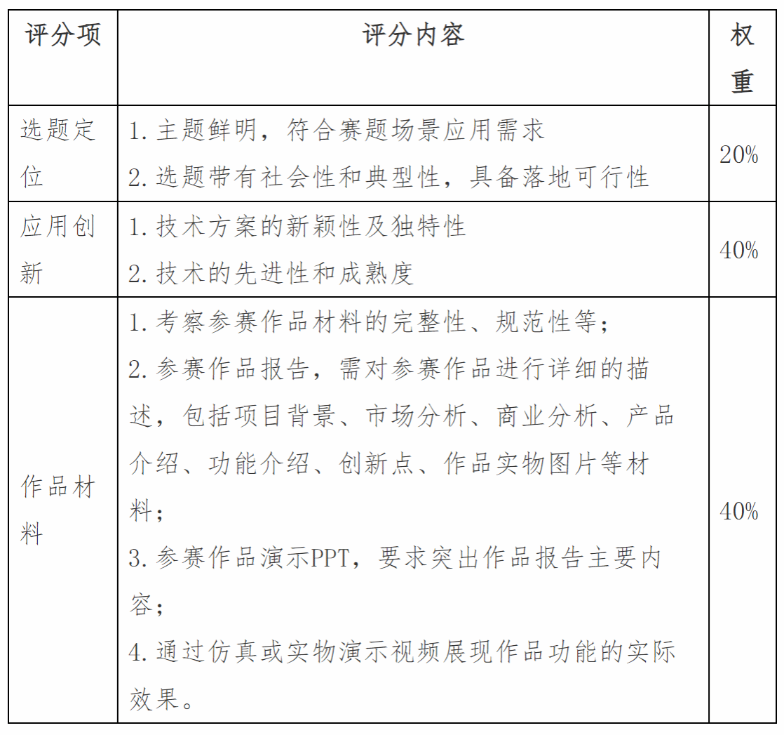 专家评委依据统一标准的评审规则,对决赛参赛作品进行客观化评审。具体评分规则如表所示。