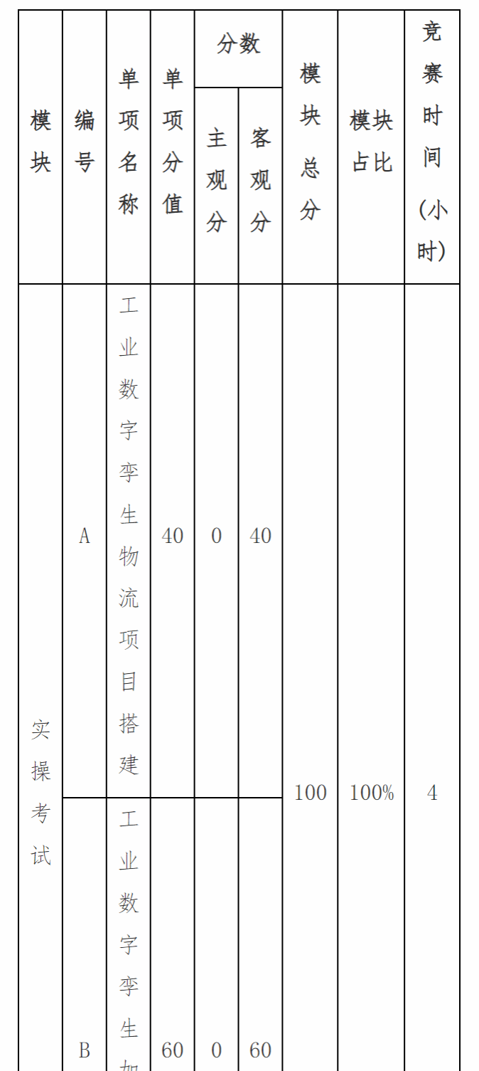 竞赛为实际操作,竞赛基于工业互联网技术,立足于工业互联网工程技术人员人才培养的总体方向;以互联网技术在电子信息制造业的应用为核心,选手利用工业数字孪生技术、调试技术与工厂数字化技术、职业素养的知识和技能,完成工业互联网技术应用技能比试。满分100分。
