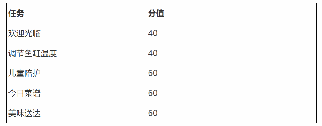 l 机器人成功将1种规定食材完全放置在灶台内,得20分;