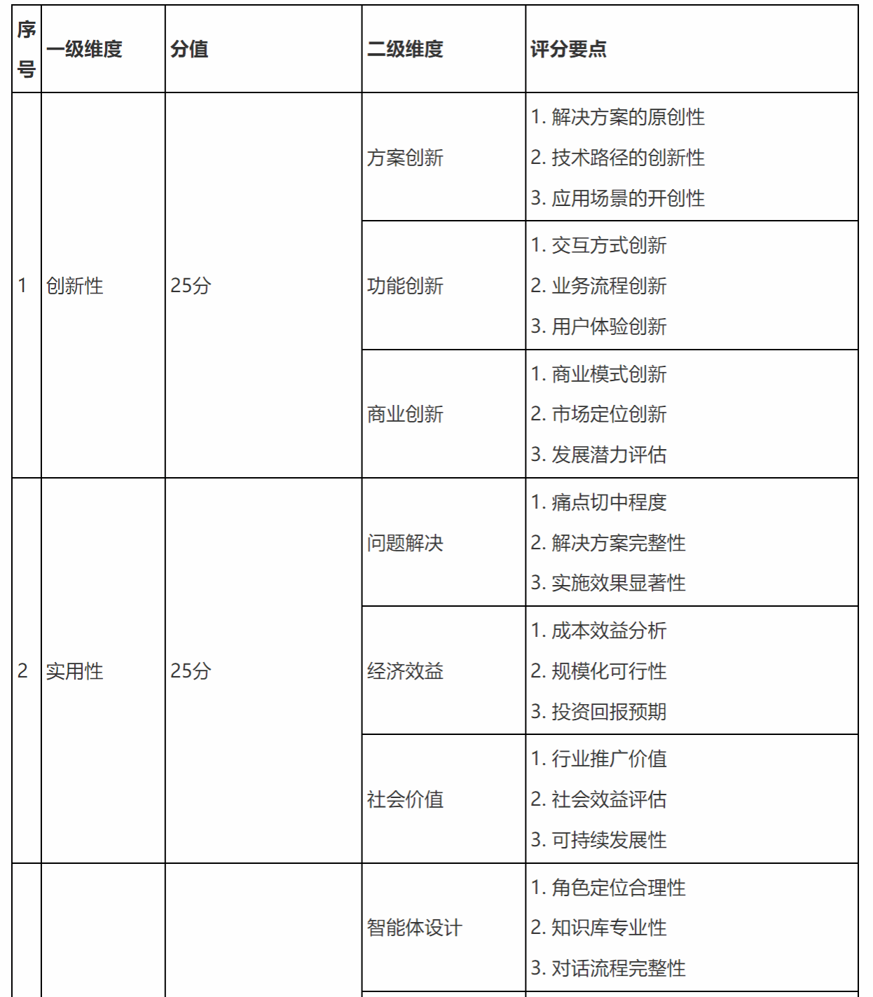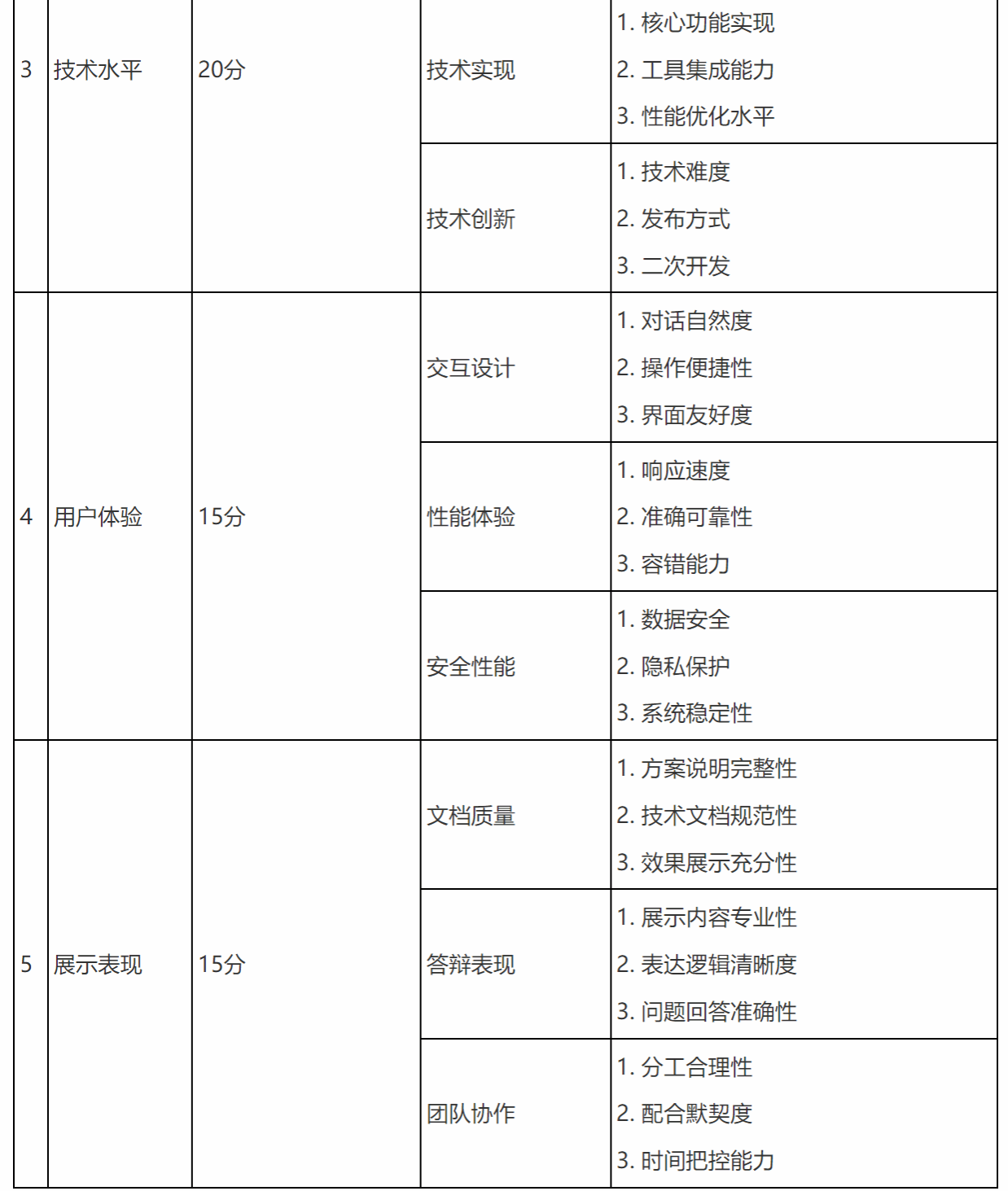 本赛题现场测试按如下规则评分:智能体创新性(25%)+ 智能体实用性(25%)+ 技术水平(20%)+用户体验(15%)+展示表现(15%),得出本赛项现场测试排名(初赛主要参考提交作品线下评选)。