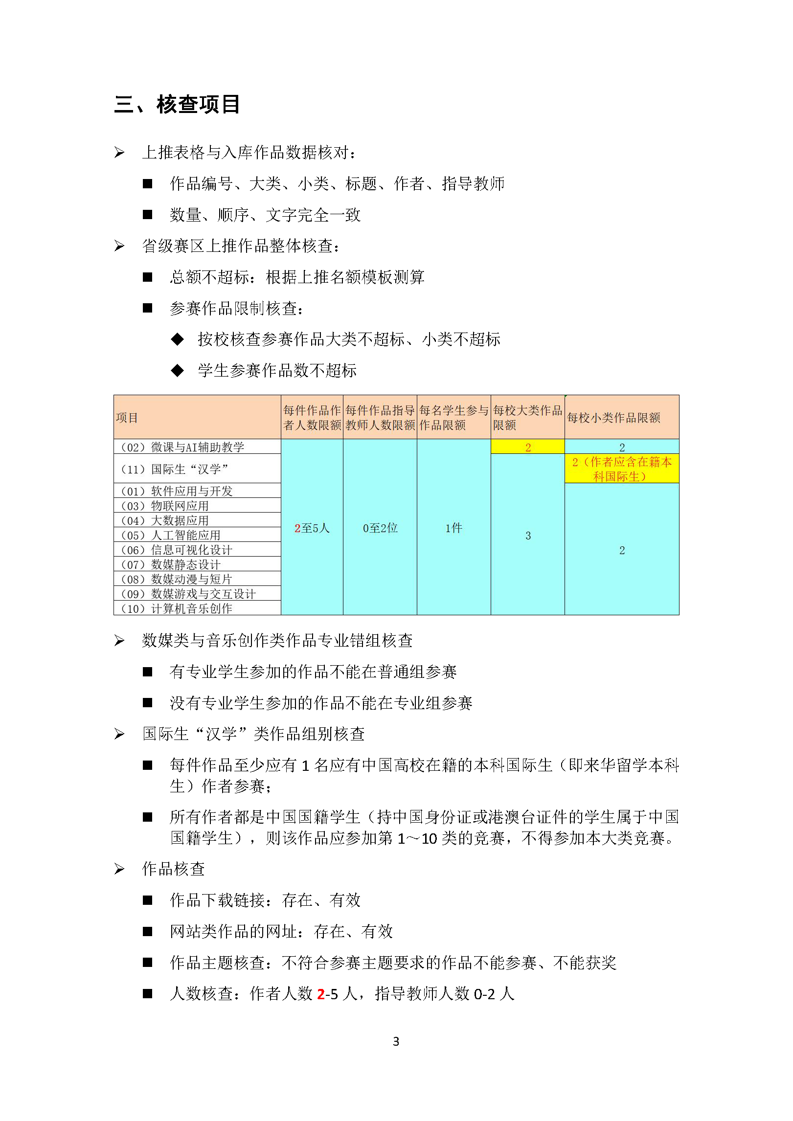 4 国赛限制条款中,每校每小类不多于2件作品,每大类不多于3件作品,因此,将出现同校作品获得省赛同一奖次但无法同时获得推荐的情况;即同校的同一小类的第3件作品,或者同一大类的第4件作品,均无法获得推荐。